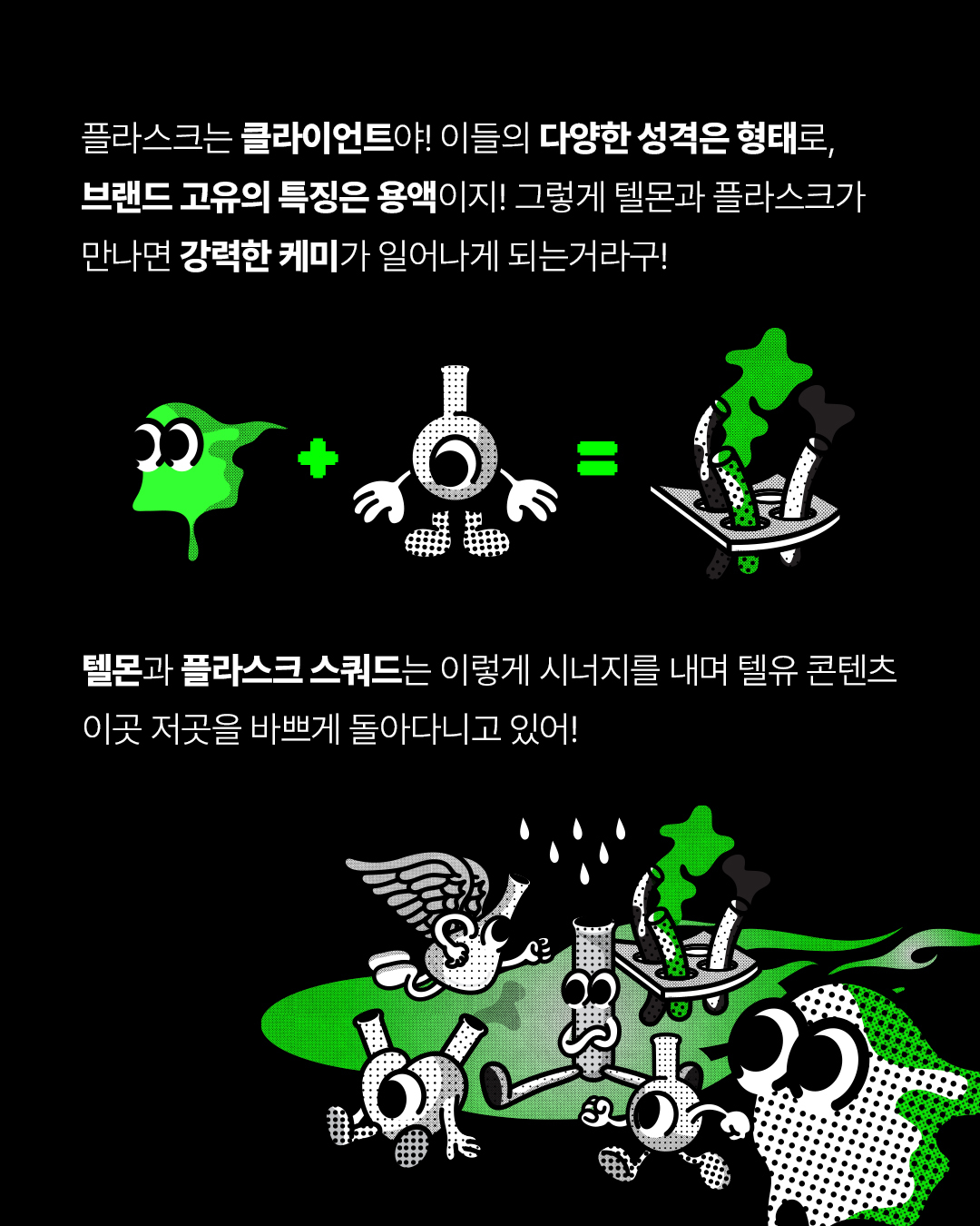 메인 캐릭터 TELLMON이 원하는 형태로 변하도록 도와주는 컨테이너의 역할과 동시에 TELLMON을 이루는 물질을 만드는 도구가 되어주는 플라시크의 무리