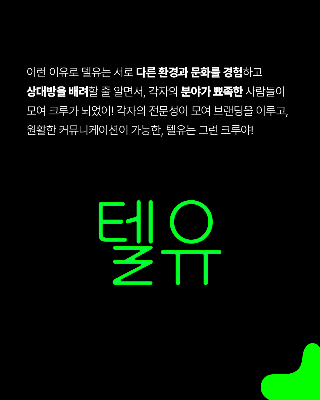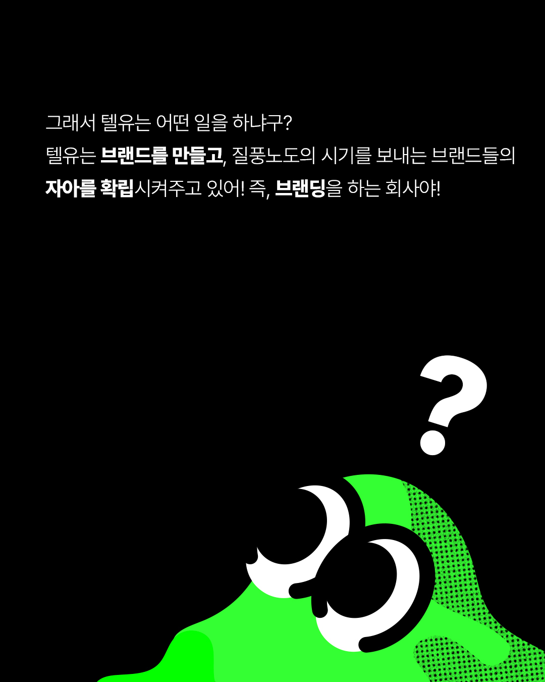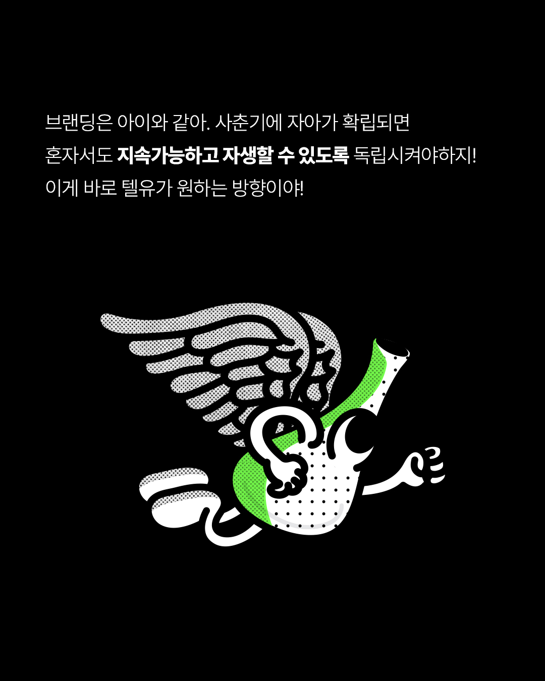 다양한 업종의 고객사가 원하는 브랜드 스토리를 견고하게 발전시키는 브랜딩&디자인 스튜디오로서의 아이텐티티를 보여주고, 실험실 속의 다양한 모양의 플라스크는 자유롭고 실험적인 시도를 과감히 보여주는 텔유의 정체성을 나타낸다. 상화보완적 관계의 시너지 효과를 이끌어내는 클라이언트와 브랜더의 관계를 보여주는 친숙한 형태의 마스코트 캐릭터