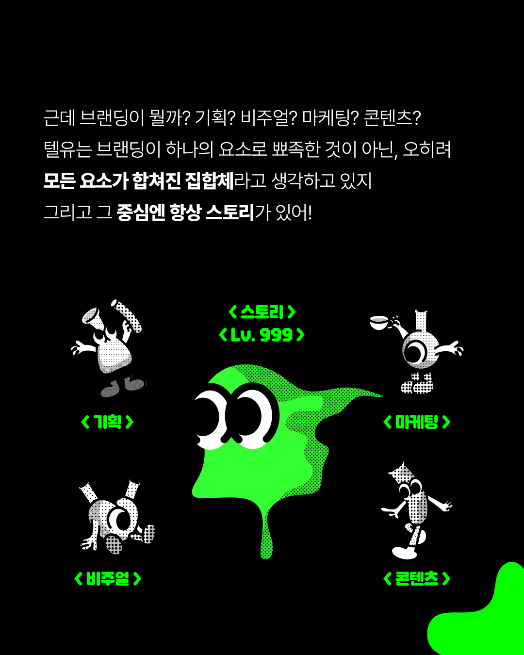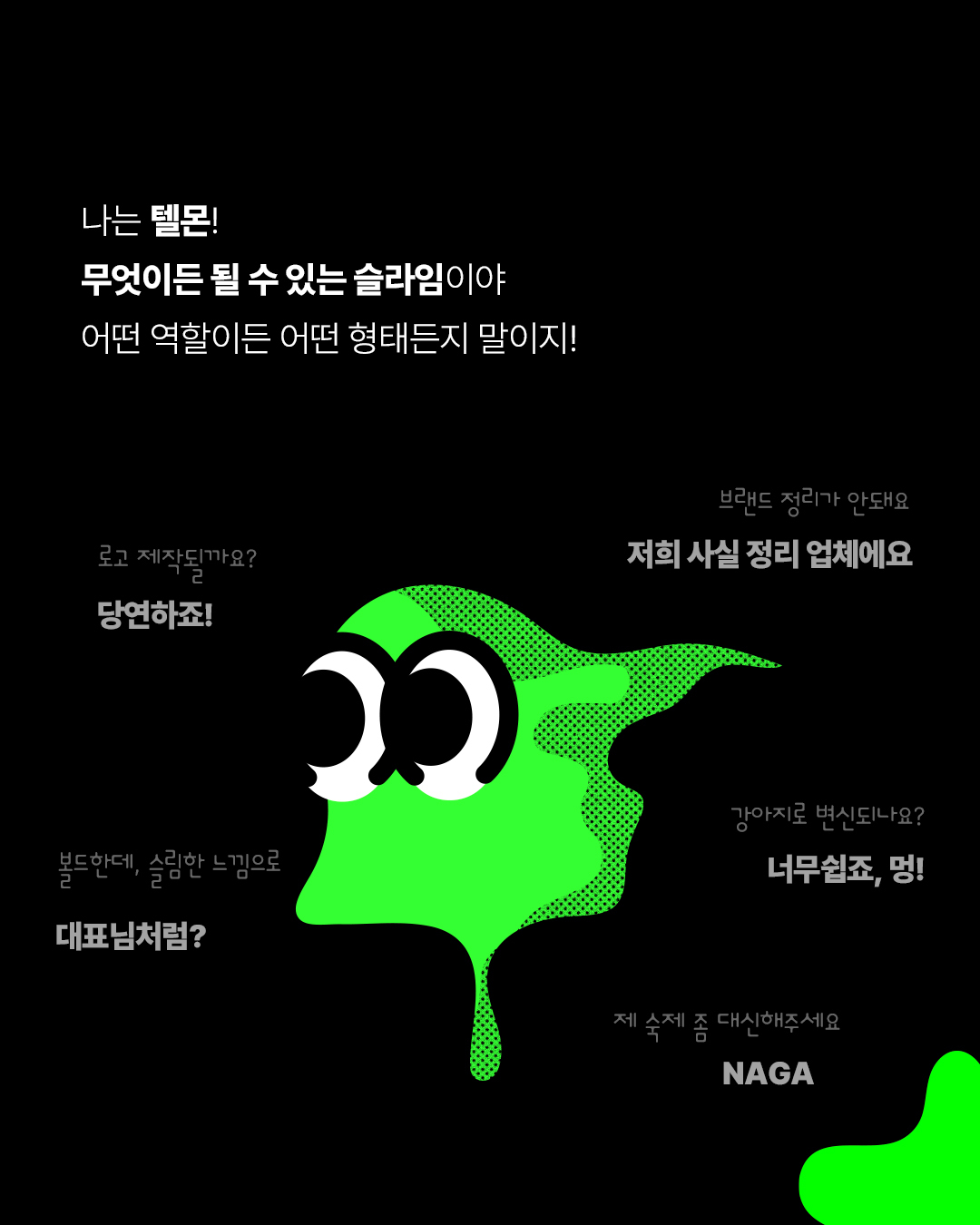 어떠한 형태로도 변모하는 Flexible한 특성에서 전개하여 트렌드를 이끄는 뉴스레터와 컨텐츠 뿐만 아니라 브랜드아이덴티티를 디자인하는 All-Rounder로서의 자질을 반영. 슬라임이라는 귀엽고 친근한 이미지와 소재의 텍스쳐에서 발전시킨 TELL YOUR WORLD의 TELLMON 캐릭터